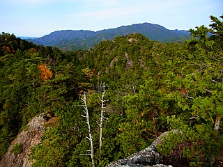 | 獅子岩の見える岩場 | 腐って危険な丸木橋 | 獅子岩から見る高土山と弓張山、城山山頂 |