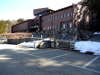 | 大町山岳博物館と駐車場 | 雪が積み上げられた登山口付近 | 池を回り込んで進む |