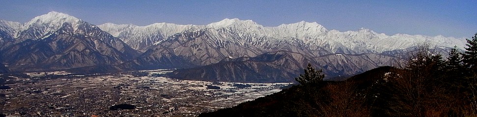 | 鷹狩山山頂展望台から見る蓮華岳から白馬岳へと続く北アルプスの大展望 | ||