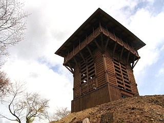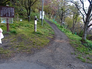 | 長峰山山頂にある新しい展望台 | 長峰山登山口と駐車場 | ヤマザクラが咲く山腹(右が光城山) |