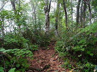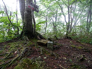 | 山行記 | ●白神岳は行程が長いので、ホテルの朝食をキャンセルして4時半に能代市内のホテルを出発した。白神岳登山口下のトイレのある広い駐車場に着くと、既に多くの車が停まり、出発の準備をしている登山者も見られた。 ●この日の天気は大丈夫なはずだったが、出発しようとした時急に雨が降りだした。カッパを着ようか迷ったが、すぐ止むだろうとザックカバーだけ付けて出発した。トイレに寄り、トイレの左から山道を登る。すぐに舗装道に出るのでそれを歩けば、登山届記載所の建物がある白神岳登山口の広場に出る。 ●ここから6.5kmの山道が始まる。まだ夜が明けきっていない薄暗い登山道にはエゾアジサイやトチバニンジン、クルマユリ、ツクバネソウなどが咲いているのがわかる。樹林の中を緩やかに登っていくが、なかなか高度が上がらないので心配になる頃、二股コースの分岐に着く。二股コースは荒廃のため通行止めとなっていた。 ●分岐から山腹を巻きながら登っていくと幾つかの水場が見られ、最後の水場と表示のあるところが一番大きな水場だ。ここが登山口から2.6km地点、まだ半分は来ていない。 ●最後の水場を過ぎるとジグザグの急登が始まる。急登を登りきると蟶山分岐だが、前後の標識にはあった「蟶山」という表示がないので通り過ぎてしまいそうだ。ここが登山口から3.35km地点、ようやく2分の1以上来たことになる。 ●蟶山は帰りに寄ることにして先へ進む。ブナの木が目立ち始めた登山道は緩急を繰り返しながら続き、登山口から5kmの地点を過ぎた辺りから森林限界になるのか、高い木が無くなりニッコウキスゲやイブキトラノオ、シュロソウなどの咲く草原になる。樹林帯を歩いていた時降りだした雨も止んだので丁度よかった。 ●その後草原の中の急登が続くが、それを登りきると「山頂まで700m」の標識がかかる十二湖分岐に到着する。後はニッコウキスゲやイブキトラノオのお花畑のある平坦な道を進めば、トイレや避難小屋のある白神岳山頂の一角に出る。三角点のある山頂はそこから平坦な道を歩き緩やかに登った先にある。 ●山頂はガスに包まれ、期待していた世界遺産のブナ林を俯瞰することが出来なかったのは残念だ。山頂で暫し休憩をして下山にかかる。途中、往きにお預けにした蟶山に登ってみた。分岐からはササが刈られたばかりの道が続くので、迷うことなく数分で三角点のある展望の無い蟶山山頂に着くことができた。 |