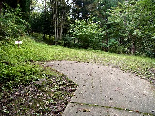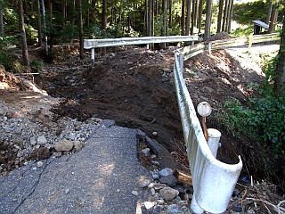 | 中禅寺駐車場 | 大雨で流された舗装道路 | 「頂上まであと100分」の標識がある広場 |