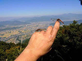 | 独鈷山山頂から見る蓼科山 | 独鈷山山頂から見る美ヶ原 | 手を高く上げると赤トンボがとまる |