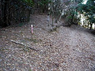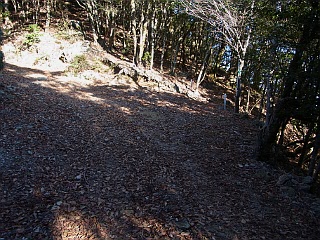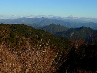 | 山行記 | ●三重県の山というと、鈴鹿山脈などの近くて魅力のある山を想像するが、三重県も南北に長く、南の和歌山県境となると、遠くてなかなか足が向かない。しかし、東海の百山完登を目指す以上避けて通る訳にはいかないので、その中でも最南端に位置するこの山を、前日登った天狗倉山、八鬼山とセットで目指すことにした。 ●前日、尾鷲からパーク七里御浜へ移動し仮眠、夜明け前に登山口の桐原方面へ向かう。事前の問い合わせでは、この山のメインの登山口である浅里登山口へは林道通行止めで行くことができず、桐原方面からなら行くことができるということだった。通行可能とは言っても林道は落石や倒木で荒れ気味だが、なんとか予定していた尾根コースの登山口まで辿り着いた。 ●登山口には、倒木や登山道の崩壊に注意を促す看板があるが、とりあえず行けるところまでは行ってみようと、薄暗い樹林帯の登山道に踏み入る。沢に沿った道は、何度か古い丸木の橋で沢を渡る。道は、倒木や落ち葉、枯れたマツカゼソウなどが覆いかぶさりわかりにくいが、その下に見える踏み跡を辿る。 ●しかし、その道もしだいに踏み跡が怪しくなり、ついに道を見失ってしまった。それからは、通りやすい箇所を選んで、徐々に急になる沢筋の斜面をよじ登る。再び登山道を見つけ、急なジグザグを登り詰めると尾根に出るが、そこでようやく子ノ泊山を示す案内表示が現れる。 ●そこから尾根道は、急坂を登った後アップダウンをしながら続く。ピークをトラバースするところでは、嫌な感じで道を塞ぐ倒木もあった。 ●浅里登山口への分岐のあるピークを過ぎると、再びアップダウンが続く。それぞれピークを迂回する踏み跡があるが、途中で踏み跡が幾つにもなり、終いには踏み跡がわからなくなるところもあるので、ここは真面目にピークを越えて進む方が無難だ。 ●やがて道は突然林道に合流する。5分程林道を歩いていくと、山頂を示す案内があるので、そこで林道と分岐する山道に入る。ロープの張られた急な登りがしばらく続くが、しだいに傾斜も緩くなり、七人塚という案内を過ぎると間もなく子ノ泊山の山頂に到着する。 ●まだ樹木の陰で半分日陰の状態の山頂には、三角点や立派な山頂表示板、ネズミがバンザイをする可愛い看板などがあり賑やかだ。そこからは、若干木が邪魔だが、熊野灘や紀伊半島の山々を望むことができた。これで山座同定ができればさらに楽しいのだろうが、残念ながらどれがどの山なのかさっぱりわからないので残念だ。また、早くも咲く準備をしつつあるアセビの花芽が真っ赤になっていた。 ●よく晴れ気温も丁度よく、いつまで居ても飽きないが、いつまで居ても仕方がないので、下山を開始することにした。帰りは来た道を戻ったが、最後の沢筋の下りは迷わないように慎重に下った。結局この日は一人の登山者にも遭うことがなかった。 |