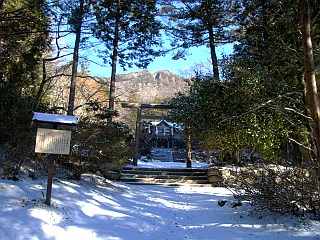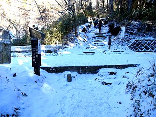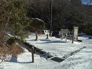 | 金時山登山口と駐車場 | 公時時神社と金時山 | 雪で覆われた舗装道を横切る |