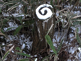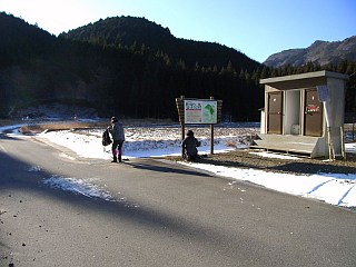 | トイレと案内板のある駐車場 | 木の橋を渡って山道に入る | 面白い雪の残り方 |