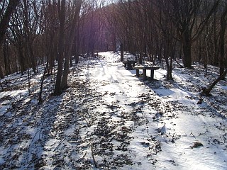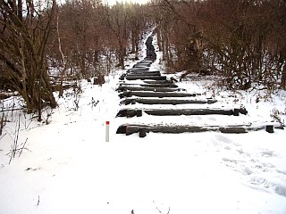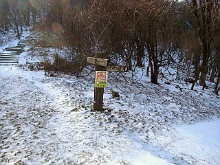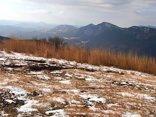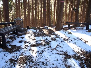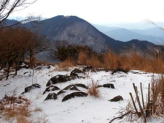 | 山行記 | ●前日の金時山は雪が多かったが、さすがに三重県の低山には雪が無いだろうと思って出かけたものの、登山口の桜峠へ行く車道から雪に覆われ、所々ブラックアイスバーン状態だ。スタッドレスタイヤを履いているとはいえ、履き潰した性能も怪しいタイヤなので慎重に桜峠を越え登山口のトイレのある駐車場に辿り着くことができた。 ●山へはまず林道を歩く、林道にも雪が積もっているが、問題無く歩けるぐらいだ。道には犬連れの登山者の足跡が山頂まで続いていた。しばらく進むと木の橋が現れるので、案内に従い橋を渡って山道に入る。植林帯の中、緩やかな登山道を登っていくと、桜峠への近道の分岐に出る。 ●分岐からは、道も急になり木の階段が現れ始める。長い階段を見上げるだけで気が滅入るが、階段はまだ始まったばかりだ。最初の長い階段を登りきった所には休憩所があり、ここで一休み。 ●休憩所からもさらに長い階段が続く。400段もの階段を登りきるとまた休憩所に出るが、そのすぐ先が東海自然歩道分岐で、右に行くと大洞山方面へ縦走することができるようだ。 ●今回は目の前の300段を越える階段を登る。山頂へはその階段を一気に登るだけだが、雪も増え、深い所では階段が見えないところもある。傾斜もしだいに増してくるので、慎重に足場を作りながら登っていく。 ●最後の階段を何とか登りきったところが尼ヶ岳山頂だ。山頂は広く、大きく刈り払われているので展望は頗る良い。隣の大洞山や倶留尊山、上野や名張の市街、メナード青山リゾート、青山高原の風車群などを見渡すことができた。 ●山頂は意外に寒くなかったが、さすがに動いていないと寒くなってくる。下山は周回コースもあるようだが、雪もあるのではっきり道のわかる往路を戻ることにした。心配された帰りの桜峠からの下り道は雪も融け始めていた。 |