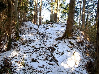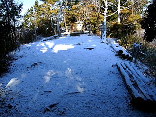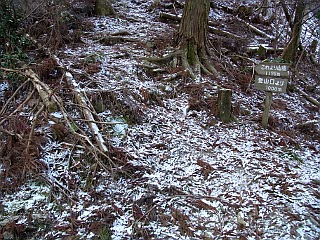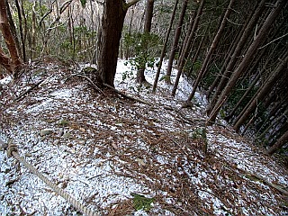 | 山行記 | ●東海の100山完登まであと2山。この日は夕方5時から用事があるが、少しでも減らしておこうと未明に豊川を出発した。久居ICを下りて狭い県道を、登山口を目指して車を走らせる。 ●矢頭の大杉のすぐ前に駐車場があったので、そこに車を停める。早朝なのでまだ一台の車も停まっていない。部分的に凍結した舗装道路を少し行くと、橋を挟んで不動滝コースと御峯コースの2つの登山口があるので、なだらかそうな御峯コースを選択して山道に入る。 ●山腹を緩やかに登る登山道は、意外に早く滝からの道と合流する。真下には樹間から不動滝を見ることができた。そのすぐ上には丸太で作られた不動滝休憩小屋が建っていた。 ●沢沿いの道をさらに登ると、椿休憩小屋が現れ、その先で林道に合流する。最近降ったと思われる雪が薄く積もっている林道を少し歩くと、再び山頂への案内があるので、それに従って山道に入る。 ●登山道には登山口からの距離が書かれた看板があるが、「登山口より1000m」「山頂へ1175m」の二つの看板がある辺りから道の雪が多くなってきた。早朝で、踏まれた雪が凍っているので滑りやすいが、登りなので何とかなる。 ●道はしだいに急になり、雪で滑りやすい急登を登りきると、大日拝展望台という秋葉大権現を祀ったピークに着く。展望台といっても木々が邪魔で視界は開けない。 ●展望台から一旦下り、岩の多い痩せた稜線を行き、急登を登ったところが矢頭山の山頂だ。山頂は一部展望が開け、伊勢湾方面と反対側の高見山地の方面が良く見える。 ●山頂で軽アイゼンを履き、ガイドブックのとおり矢頭峠方面へ下ることにする。ロープの張られた急なアップダウンがしばらく続き、落ち着いたかと思うとそれ以上の急坂となり、あっという間に県道の通る矢頭峠に到着する。 ●峠からは、舗装された県道の急な峠道を下って車の置いてある矢頭大杉の駐車場を目指す。矢頭大杉の駐車場は、来た時とは違い満杯になっていた。 |