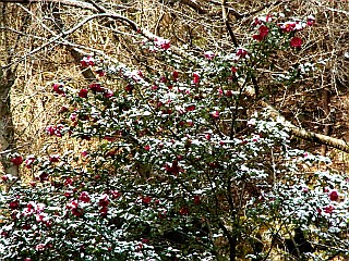 | ロープの張られた急坂が続く | 県道が通る矢頭峠と登山口 | 椿の花も雪を被っている |