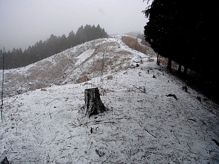 | 植林の中みるみる雪が積もっていく | 伐採地は既に雪だらけ | 北笠岳方面分岐 |