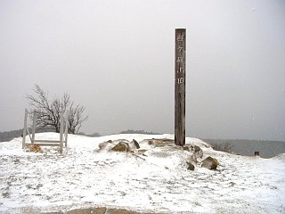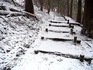 | 山行記 | ●この日の天気予報は晴れ、ということで、東海の100山で登り残しの三重県の2山を目指す。どちらも往復のコースタイムは2時間〜3時間なのでゆっくり登って帰ることができると思って出かけた。 ●ところが、錫杖湖付近は雨、しかも風もかなりある。おまけに、経ヶ峰方面の林道入口に通行止めの看板が立てられていた。それでも行ける所まで行って後は歩けばいいと思い、そのまま進んでみることにした。 ●途中、雨水のためにアスファルトがズタズタになっているところや、土砂崩れの跡や落石など、帰りには通れなくなっているのではないかと心配になる程林道は荒れていたが、何とか起点の林道の分岐まで入ることができた。 ●だが、ここまできても雨は止まない。それでもせっかくここまで来たのだし、雨もいずれ止むだろうと思って、ジャケットとスパッツという姿で出発する。始めしばらくは林道歩きで、大きく曲がった傾斜のある林道を歩く。 ●途中林道が交差するが、右方向は通行止め、左方向は橋の先が崩れ落ちている。さらに行くと林道は終点となり、芸濃町の小さなプレートが経ヶ峰の方向を示している。 ●それに従い沢沿いの岩場を進み、沢を渡ると植林の中の山道が始まる。雨はいつしか雪に変わり、みるみるうちに辺りを白く染めていく。やがて、伐採地に出る頃には雪は風を伴いますます強くなる。 ●天気が良ければ展望を楽しみながら登るところだが、これでは何も見えず、とにかく我慢して登る。伐採地から再び植林地に入ると道は左右に分かれる。右は北笠岳方面へ、左が経ヶ峰方面なのでそちらへ進む。 ●軽いアップダウンのある道は、すぐに稲子山方面への道を分け、間もなく立派な休憩舎が目の前に現れる。休憩舎は広場の中に建てられており、トイレ棟まで整備されている。 ●ここまで来れば山頂まではあと一登り。大きくジグザグを切って木の階段を登りきれば経ヶ峰山頂に到着だ。山頂には大きな木の標柱と三角点があり、直下には東屋や木製の展望台、案内の看板などが設置されている。 ●風雪は止むどころかますます強くなり、天気が良ければ360度の展望が広がるところだろうが、これでは何ともならず、下山を開始した。往きに雪上に付けた足跡はほとんど見えなくなり、雪の無かった林道まですっかり雪で覆われていた。 |
