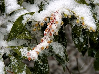 | 広場に建つ立派な休憩舎 右はトイレ棟 | 雪積る木の階段を登れば山頂に到着する | 花が咲きかけたアセビもこれでは可哀そう |