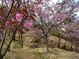 | 山行記 | ●4月に入って忙しい日が続き、なかなか地元の山へ春の花を見に行くことができなかったが、それでも気になるので時間を作って出かけてみることにした。世界の桜で売り出し中の比丘尼城址も、メインの桜の時季が終り、少し人足が鈍った頃で、駐車場にはまだ車は無かった。 ●歩き始めるが、思った程花が見つからない。しかし、良く見るとフイリフモトスミレが咲いているのに気付いた。まだ蕾のものが多かったが、小さな花がけなげにいっぱい咲いていた。 ●東屋から比丘尼城址、愛の鐘にかけては、いろいろな種類の桜が咲いているが、外の花はなかなか見つからない。今年の春は遅いのか、と思いながら先へ進む。 ●おすすめの小径から離れて金山方面へ行くと、いつものコバノミツバツツジが見頃を迎えていた。前回薮っぽかった道も、いつの間にかきれいに草刈りがされ、倒木も片付けられていた。 ●金山原生林から林道を横切り、ジグザグの登りを登り終えると金山の山頂に着く。少し休憩した後、県境稜線を歩く。アセビの花の終った樹林には、ヤマウグイスカグラやヤブツバキの花が目立った。 ●裸地から雨生山にかけては、コアブラツツジが一斉に咲き始め、ハルリンドウもいたるところに咲いており、茂みの中を目を凝らしてみるとシュンランが、目立たないが可愛い花を咲かせていた。 ●草刈りがされた雨生山山頂から一旦展望ピークまで戻り、雨生山反射板を経て下山を始める。この間はコアブラツツジやハルリンドウに加えクサボケなどの花々が咲いており、いつの間にかこの辺りは春の花の季節を迎えていた。 ●林道から再びおすすめの小径へ戻ると、数は少ないが、イカリソウやツクバキンモンソウなども見ることができた。いつものようにおすすめの小径の西登山口へ下ると、春爛漫の田園地帯の中の車道を歩いて車を停めた比丘尼駐車場まで戻った。 |