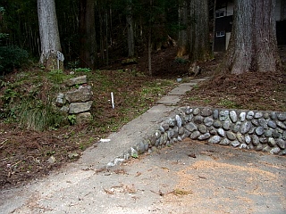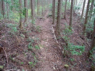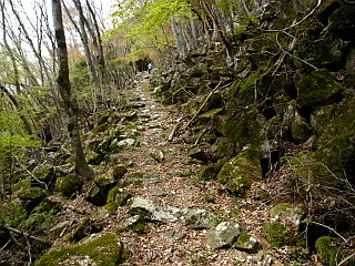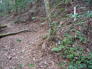| 山行記 | ●古戸山から下り、まだ時間は十分あるので、古戸山からよく見えた御殿山へも寄っていくことにした。月の集落を通る国道473号線から山側へ続く狭い車道を走って槻神社の駐車場に着く。駐車場には一台の車も停まっていなかったが、支度をして出発する頃一台の車が到着した。駐車場のすぐ傍にはニリンソウが咲いていた。 ●槻神社でお参りを済ませ、神社から左へ続く緩やかな道を進む。道はすぐに右に折れ、掘割状の道になる。途中2本の倒木があり、その下を潜るのも大変そうなので、掘割の上から越えることにした。 ●やがて道は大きな岩が累々と積み重なる地帯を歩くようになる。この地帯は雑木林になっていて明るく、大半が植林というこの山の中にあって一味違った雰囲気だ。 ●再び植林帯に入りさらに進むと、道は右に折り返す。その後、二度折り返しながら高度を稼ぎ尾根に出る。尾根道は緩やかで、途中三ツ瀬明神山が良く見える場所がある。そこから見る尾籠岩山の背後に聳える三ツ瀬明神山の姿は圧巻だ。 ●尾根道も少し傾斜が増してくると、一対の石仏が現れる。道はさらに傾斜を増し、途中御神木と石仏を見ながら登っていくと、小広場に建つ荒れた小屋が見えてくる。 ●小屋の建つ広場から急な石段が始まり、それを登っていくと一対の石仏の向こうに神社が見えてくる。神社は御殿山の山頂に建てられており、神社の裏手が広場になっていて三角点や山頂を示す小さな白い木の標柱がある。 ●山頂は、樹林の中で展望はないが、ヤブツバキが花を着けていた。下山は来た道を戻った。 |