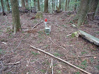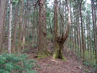 | 尾根道に出る | 展望ポイントから見る三ツ瀬明神山 | 御神木とその裏に石仏がある |
