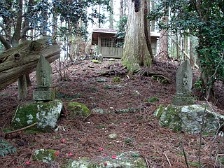 | 小広場に建つ荒れた小屋 | 一対の石仏の裏に山頂の神社が見える | 展望のない御殿山山頂 |