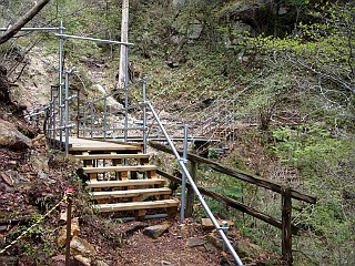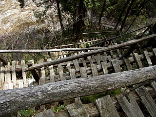 | 登山道の崩壊箇所は修復されている | 落差約100mで圧倒的な迫力の天河滝 | 天河滝からは木の桟道を登る |