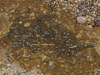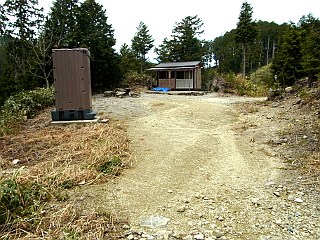 | ヒキガエルの卵が産みつけられている水溜り | 見事な素掘りのトンネル | 林道途中にある休憩舎とトイレ |