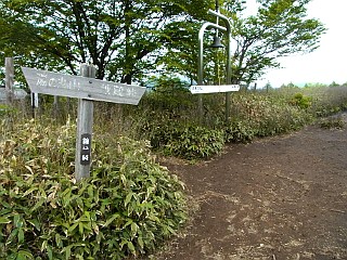 | 広々とした湯ノ丸山山頂 | 湯ノ丸山山頂から見る浅間山へ続く稜線 | つつじ園への入口となる鐘分岐 |