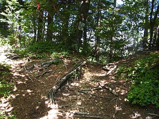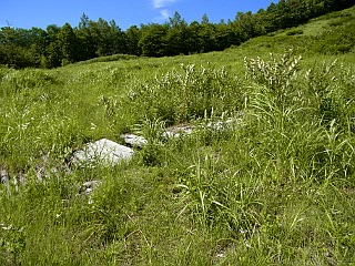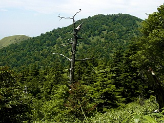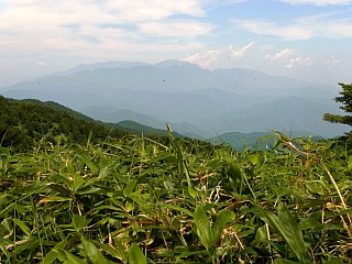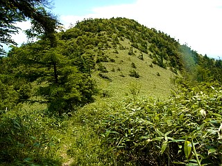 | 山行記 | ●先日名古屋で開かれた夏山フェスタで知った「阿智セブンサミット」というイベントは、7月から11月までの間に、長野県阿智村にある7つの山を巡り、山頂にある看板と一緒に撮った写真を見せると記念のバッジが貰えるというイベントで、妻が乗り気なので、全て登ったことのある山ばかりだが、それも目指してみることにした。 ●最初に選んだのは大川入山。最初は一番ボリュームのある恵那山にしようと思ったが、台風8号が通り過ぎたばかりでアプローチの林道に不安があったので、2番目にボリュームのありそうなこの山にした。朝6時頃豊川を出て、あららぎ高原スキー場には8時過ぎに到着した。駐車場には既に一台の車が停まっており、男女の登山者が支度をしていた。 ●こちらも支度を終えると出発する。最初はゲレンデの中を歩くので、日差しをもろに受けて暑い。ゲレンデには、まだオオマツヨイグサが開いており、ニガナやノアザミ、ヤマオダマキ、オカトラノオなどの花が咲いていた。 ●スキー場のレストハウス雪坊主の横を通る。その先で左へリフトを潜って大川入山登山口に行かなければならないのだが、案内看板が見当たらず、そのままリフトの右側を進んでみるが、やはり違うようなので戻って良く見ると、森の縁に標柱らしいものが見えたので、それをめがけて薄い踏み跡を辿ると、見えていた標柱に大川入山登山口と書いてあったので一安心。 ●そこからは樹林帯で、涼しい風も吹いていて快適だ。登山口から少し下り、沢を渡って白樺が美しい緩やかな道を進む。すぐに森林開発公団長野出張所の大きな看板が現れるので、道なりに折り返すと急な尾根道の登りが始まる。道は、支尾根をスイッチバックしながら高度を稼いでいく。 ●やがて尾根に出ると紙の案内があり、以降痩せた尾根道を緩やかに登る。樹林の中、マイヅルソウの葉やギンリョウソウ、ジンバイソウの葉などが目立つ。 ●尾根道の傾斜がきつくなってくると地図上で言う三角点に着く。そこからは、緩やかなアップダウンが続き、少しずつ展望の開けるところがあり、治部坂スキー場の上に、対峙する蛇峠山や双耳峰の大川入山の山頂部なども見えてくる。 ●やや傾斜がきつくなり、それを登りきった所が、恩田大川入山への分岐だ。紙の案内では直進方向が恩田大川入山方面なのだが、実際には道は無く、左の大川入山方面へ進む。 ●分岐からはしばらく下りが続く。下りきったかと思うとまた下り、心配になってくるが、何とか鞍部に到着すると、これからは山頂目指して登りが続く。意外と緩やかな登りを我慢して登ると、大川入山の北のピークに着く。北のピークからは、僅かに下り、笹の鞍部から本峰へ登り返す。この間は思った程時間はかからない。 ●三角点のある大川入山山頂は小広く、治部坂方面から来たと思われる登山者が既に何組か休憩をしていた。まずは、阿智セブンサミットの看板を探すが見当たらない。休憩している登山者にも聞いてみるが、皆口を揃えて知らないという。 ●これではせっかく登って来たのが無駄になってしまうと、諦めかけた時、スキー場で先に出発したが途中で抜かした男女の登山者が登って来た。どうやらその登山者がその看板を立てに来たようで、到着すると早速その看板を立て始めた。最初見た時、変な荷物を持ってるので不思議に思ったが、それがその看板であることが初めてわかった。 ●看板を立てている人に話を聞くと、外の山にもここ何日かで看板を立てているそうで、恵那山は二日後の月曜日に立てる予定ということだ。もし、この日恵那山に登っていたら看板は無かったということで、いろいろな偶然が全て良い方に向かったという幸運に感謝した。 ●看板が立て終わると、早速写真を撮り、山頂の展望を楽しみながらゆっくりと休憩した後、帰路は来た道を戻った。 |