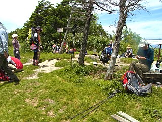 | 北のピーク付近から見る大川入山山頂 | 双耳峰の鞍部から見る中央アルプス | 多くの登山者が休憩する大川入山山頂 |