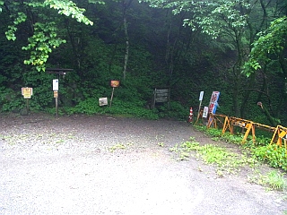 | 市内山峠の駐車場と登山道入口 | 山頂まで2.2km標識とガードレール | 挟岩 |