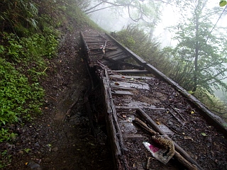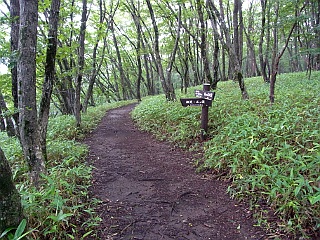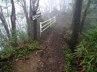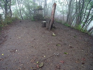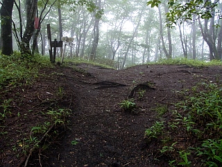 | 山行記 | ●この山は、以前浅間山を登った時、黒斑山までしか登ることができず、時間も体力も残っていたので登ったことがあるが、何の下調べもしていなかったので、艫岩が山頂だと思って、そこで引き返してしまったことがある山だ。この山も、信州100名山完登を目指すにあたって気になっていた山だったので、登り直すことにした。 ●この日の天気も大気が不安定な状況なので、朝のうちが勝負と思い、昨日程ではないが小諸のホテルを早めに出て、登山口の内山峠へ向かった。平地から山道に入るとガスっぽくなり、駐車場に既に停まっていた数台の車の登山者たちも出発を躊躇しているようだった。 ●こちらは遠路遥々来たこともあり、登っておきたいという意思も強く、躊躇なく出発しようと支度をしだすと、車で様子見をしていた登山者たちも支度を始めた。 ●ガスは朝のうちだけと思い、とにかく出発する。登山口から一旦下り、山腹に付けられた道を進む。道は意外にアップダウンが多く、途中切り立った箇所にはガードレールが設置されていたり鎖が張られたりしている。登山道には、峠からと山頂までの距離が書かれた標識が整備されており、道端にはノリウツギやカラマツソウ、サワギクなどが咲いていた。 ●山頂まで1.7km標識を過ぎると道はジグザグの登りとなり、それを登ると再び緩やかな道になる。途中壊れた橋が何箇所かあり、やがて巨大な挟岩の下に着く。 ●挟み岩を巻いてさらに進むと、一杯水という水場に出る。一杯水を後にすると、岩の多い急登が始まる。クサリやロープのある急登は、前日の雨で濡れていて滑りやすいが慎重に行けば大丈夫だ。 ●岩場の急登を登りきると道はササと灌木の緩やかな道に変わる。「艫岩西端」と書かれたホウロウの看板がレトロな感じでいい。そこから艫岩展望台まではほんのわずかだが、ガスはなかなか取れず、期待した展望もこれではどうしようもない。 ●仕方がないので帰りに期待して山頂を目指す。休憩所の横を抜けるとすぐに三ツ瀬方面の道を分け、短いササの平坦な道を進む。水源を渡り、碑を見ながら軽快に進んでいくと、荒船不動からの道と合流する。 ●合流点から道は急登となり、しばらく我慢して登りきると荒船山の最高地点となる経塚山(行塚山)の山頂に着く。それ程広くない山頂は、樹林に囲まれ展望は無く、三角点と祠が祀ってある。 ●山頂で少し休憩した後下山を開始する。期待していた艫岩展望台からの眺めは、相変わらずのガスのため得ることはできなかった。 |