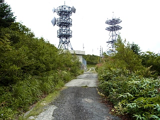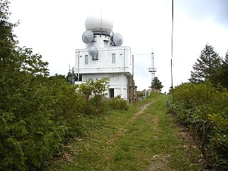 | 林道から見る三ツ瀬明神山 | 蛇峠山山頂は通信施設の鉄塔がいっぱい | レーダー雨量計の横から山頂を目指す |