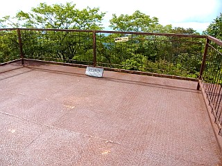 | レーダー雨量計から山頂を望む | 蛇峠山山頂の展望台 | 展望台から見るセブンサミッットの看板と三角点 |