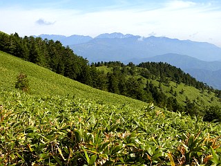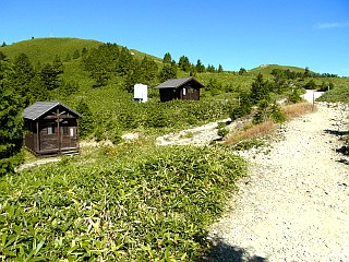| 神坂小屋とトイレ 右奥は富士見台 | 笹原の向こうに見える中央アルプス | 富士見台山頂を見上げる |
