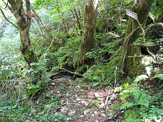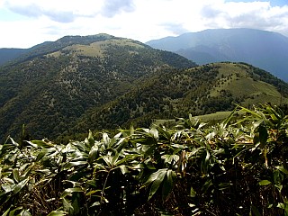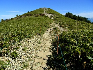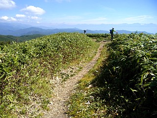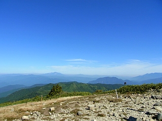 | 山行記 | ●阿智セブンサミット完登まで後4山。南沢山が、ふるさと村自然園からのコースが通れないという情報があったので、富士見台から入り、南沢山を一緒に登ってしまうことにした。 ●登山口は神坂峠の萬岳荘、ここまで車で来るには、園原方面からは入ることができないので中津川方面からのアプローチしかない。豊川を朝6時ごろ出て、朝食や食料調達をしながら9時頃萬岳荘に着いた。 ●車は、萬岳荘の指示通りすぐ近くの駐車場に停めて、萬岳荘脇の登山道入口から緩やかな石段を登る。ササ原のジグザグ道にはヤマハハコやヨツバヒヨドリ、アキノキリンソウなどが咲く。 ●稜線で御坂峠方面へ道を分け、富士見台方面へ緩やかな稜線道を登っていくと、無人の神坂小屋とトイレが現れる。稜線からは、行く手に中央アルプスや御岳、乗鞍岳が、右手にはササ原の彼方に南アルプス連峰が、左手にはには中津川市街地と笠置山、二ッ森山などが、そして振り返れば恵那山が大きく聳えている。 ●稜線の展望を楽しみながら登っていくと呆気なく富士見台の山頂に到着する。富士見台山頂は、まさに遮るものの無い360度の展望が広がる。ここまで来る間ずっと見えていた展望ではあるが、改めて感動させられる。 ●富士見台で360度の展望を楽しんだ後、南沢山を目指す。展望のいい緩やかな道を下っていく。樹林帯に入るとすぐ地塘のある小さな湿地帯に出るが、それを過ぎると再び周囲が開け、以降は傾斜の急なジグザグの道になる。 ●急傾斜を下りきると再度樹林帯となり、道は平坦な山腹道となる。途中水場を通り、隣の尾根に出る。ここからは尾根伝いに湯舟沢山への緩やかな上り坂を登る。 ●大きな登りもなくピークに着くと、登山道の隅に湯舟沢山と書かれた木のプレートが置かれている。これがなければ山頂とは気づかずに通り過ぎてしまいそうな地味なピークだ。 ●湯舟沢山から少し下り、いくつかのピークを越えて、その後山腹を回り込むように登っていけば横川山の山頂に着く。三角点のある横川山山頂は360度の展望が広がっていた。遠くの山には少しずつ雲がかかり始めたので、この日はこれが見納めかと思いしっかりと展望を満喫した。 ●横川山山頂からはしばらく下りが続く。今回は往復なのでこの道をまた登るのかと思うと気が滅入るが仕方がない。鞍部からは南沢山への登りが始まるが、思ったよりは傾斜も緩く、何度か緩急しながら進むと山頂一角に出る。 ●山頂一角といってもそこから山頂までが意外と長い。ほとんど平坦なので苦にはならないが、結構歩いた後到着する山頂は、周囲の木が伸びて、展望もない地味な広場だ。 ●これでは、ここで休憩しても仕方がないので、展望のいい横川山まで戻ってから休憩することにする。阿智セブンサミットも南沢山ではなく横川山にすればよかったのではないかなどと思いながら、横川山で休憩した後来た道を戻った。 ●天候は、往きの上天気とは裏腹に、しだいに雲が多くなり、富士見台に着いた時にはすっかりガスに包まれてしまった。いずれにしても、往きの大展望はもう見る影も無い。富士見台山頂には数人の人がいたが、ガスの中寒そうにしゃがみこんでいた。 |