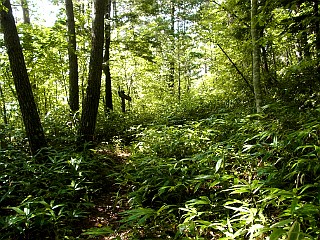 | 山行記 | ●阿智セブンサミットも後2山となった。残るのは高鳥屋山と網掛山、どちらもコースを選べば1日で登ることができる。ということで、まずは高鳥屋山。最短で山頂まで行くことのできるの鳩打峠から登ることにした。 ●山本の街から鳩打峠へ向かう狭い道を進む。この道は大平に繋がる道で、意外と行き来する車が多いが、今回はことごとく出会うタイミングが良く、難無くトンネル手前の東屋の建つ高鳥屋山登山口の駐車場に着くことができた。 ●駐車場の道を挟んだ反対側が登山口で、いきなり急登が始まるが、それほど長い距離ではなく、程なく鳩打峠に到着する。ここで高鳥屋山を目指して左へ進むが、峠から大平方面への道も踏み跡が続いている。 ●峠からは一転して快適な稜線歩きかと思っていたが、ここからも急な登りが続く、そして、斜面はさらに急になり、それを登り切るとなだらかなピークに出る。 ●この辺りが地図上の1,362mのピークで、以降道は緩やかなアップダウンの道となるのだが、露で水分を含んだササが両側から被さり、ズボンが濡れるので快適とはいえない。 ●ササはさらに深くなってきて、肩の辺りまで覆い被さり、道も見えないようなところもある。再び坂が急になり、それを登り切ると小屋の屋根が見えてくる。高鳥屋山の山頂はそのすぐ上の広場だ。 ●高鳥屋山山頂からは、南アルプスは塩見岳や小河内岳方面が見えるのみで、ほかは生憎雲がかかってすっきりと見ることができず、麓の飯田山本インターがよく見えた。また、山頂は既に紅葉が始まっており、赤と緑の葉のコントラストが美しかった。 ●帰りに山荘を見ていく、山荘の入り口の戸は無く、ブルーシートが垂らしてあるのみで、荒れた感じだった。小屋の周りにはトリカブトやツリガネニンジン、シナノナデシコなどの花が咲いていた。帰りは来た道を戻り、次の網掛山を目指した。 |