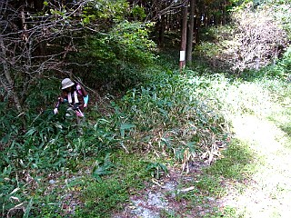 | 林道から尾根を目指した箇所 | 尾根には赤テープと踏み跡がある | 高土機山山頂まで続く薮っぽい踏み跡 |
