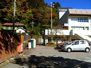 | 起点となった福島支所 | 青空と紅葉が眩しい | 福島小学校横の城山史跡コース入口 |