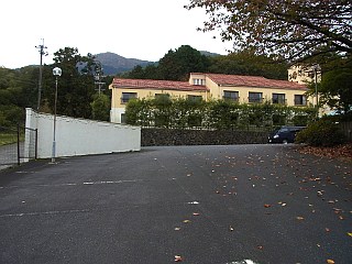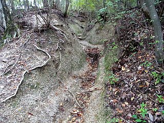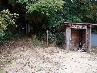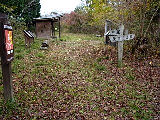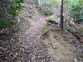 | 国民宿舎丹後由良荘 | 登山道入口の小屋と獣除けのフェンス | 深い掘割の登山道 |