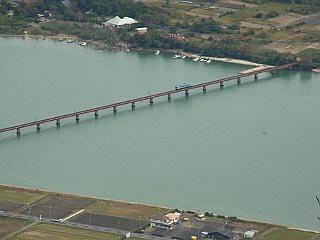 | 東峰山頂から見る幾重にも重なる山並 | 東峰山頂から見る由良の街 | 東峰山頂から見る鉄橋を渡るタンゴ鉄道 |