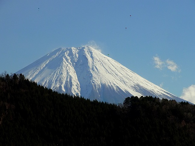 三石峠展望台から見る富士山 空にはパラグライダーが浮かぶ |