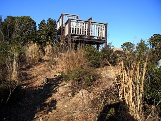 | 衣笠自然歩道小衣笠の道入口 | 松尾尾根コース登り口と衣笠山 | 展望台の立つ衣笠山山頂 |