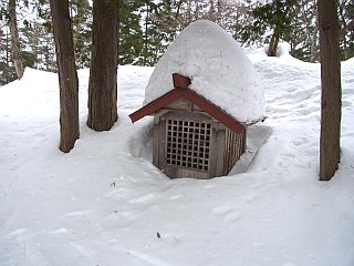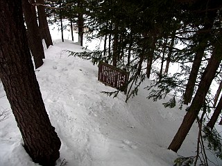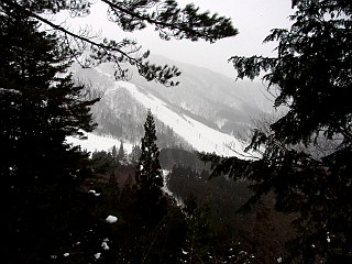 | 山行記 | ●この日は、昼過ぎから雪か雨が降るという予報なので、簡単に登れるこの山へ寄って帰ることにした。この山は、以前無雪期に登ったことがある。その後、熊の目撃情報があったということだが、この時季なら大丈夫だろう。 ●今回は、長谷寺の駐車場に車を停めさせていただき、下山する反対側の五竜とおみスキー場からは、林道を歩いて戻ってくるというコースを採ることにした。長谷寺は、先日の地震の影響か、屋根が壊れブルーシートが掛けられている部分もあった。 ●今年は積雪が多く、敷地内には至る所に雪の壁ができており、寺の敷地から出る道もできておらず、雪の浅い所を選んで何とか出ることができた。 ●登山口を探すが、雪が多くてどこかわからず、途中、踏み跡のある所から登ることにした。正しい登山口ではないので、斜面が急で、いきなりスノーシューの※ヒールリフターを使って登る。 ●急坂は、小さなピークを越え再び急坂になり、ひたすらそれを登る。葉の落ちた木々の間からは、雪に閉ざされた里が見えるが、登るにつれ小さくなっていく。 ●山頂が近付くと、傾斜も緩くなり、ヒールリフターが邪魔になり始めるので下ろして歩く。やがて飯森城址に着くが、雪が深いので、説明の看板も読めない程だ。 ●飯森城址からすぐの所が一夜山の山頂になるのだが、やはり雪に埋もれてはっきりわからない。木々の間からは飯森ゲレンデや五竜とおみスキー場のゲレンデが見え、ゲレンデに流れるBGMも聞こえてくる。 ●山頂を過ぎると道は下り始める。このコースのトレースは獣の足跡だけだが、よく歩かれているようで、昨日の権現山のように深く沈みこむことは無い。 ●五竜とおみスキー場からは一夜山に登り、下った長谷寺から林道を登るというツアーを土日に予約制で実施しているようだが、この雪の状態では、この土日は参加者がいなかったようだ。 ●道は、井戸跡という遺跡を経て五竜とおみスキー場の駐車場に下り着く。せっかくなので、いつも寄るエスカルプラザで少し買い物をした後、林道を下ることにする。 ●林道は、別荘のある部分までは除雪した跡があるが、それを過ぎると除雪がされておらず、所々倒木が邪魔な道を、トレースを頼りに下っていく。 ●下りも一段落し、民家が見えてくると再び除雪された道になる。いつの間にか降りだした雪は、しだいに激しくなってきたので、長谷寺の駐車場に着くと急いで道具を仕舞って長谷寺を後にした。 ※ヒールリフター=急斜面を登るため、スノーシューのかかとを上げた状態に保つ仕組み |