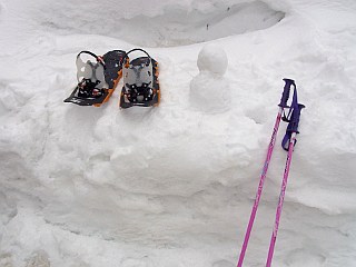 | エスカルプラザから林道を下る | 倒木が邪魔する林道 | 雪だるまと使用したスノーシュー |