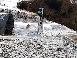 | 左右集落の駐車地点 | 登山口で待つ犬 | 犬はまっしぐらに走って行ってしまった |