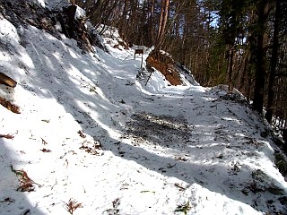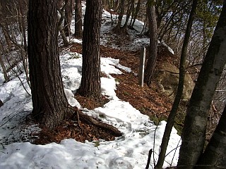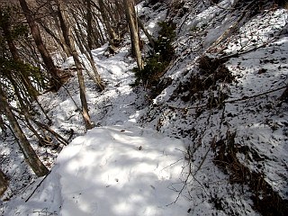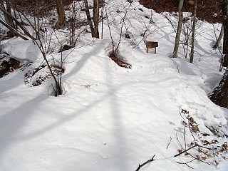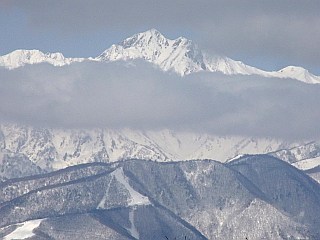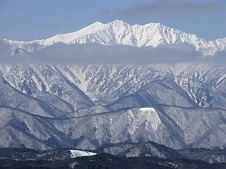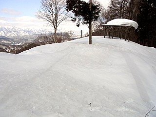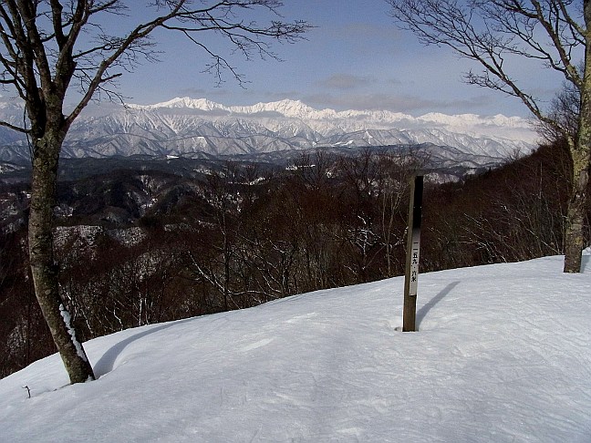 | 山行記 | ●蕎麦で知られる信州新町の左右集落から登ることのできる山を見つけた。その山は、頂上付近まで林道が走る積雪期にスノーシューで登るには打ってつけの里山だ。 ●下調べでは駐車場がよくわからなかったが、登山口の所にお蔵があり、その傍らに空き地があったのでそこに停めさせてもらうことにした。 ●支度をしていると、犬が現れこちらに向かって吠えている。朝なので集落の皆さんに迷惑になってはいけないと、犬を呼ぶと、繋がれていないようで、こちらに寄って来た。そして、登山口まで行ってこちらに向かって吠えている。 ●そういえば、この山をネットで調べていた時に、犬が山を案内してくれたというものがあったのを思い出した。グーグルアースでも、ここでこの犬が写り込んでいるのを見たことがある。 ●それでは犬の案内で出発。と思いきや、犬はさっさと先に行ってしまった。斑に雪の残っていた道は、やがて全て雪に覆われた状態になったのでスノーシューを履く。 ●犬は先に行ってしまいその姿を見ることはできなかったが、後で聞いた話では、今年に入って左右の集落で長者山に登った人はまだいない、というぐらい踏み跡が無い中、犬の足跡はいい道標だ。 ●10分程歩くと林道から分岐して山道に入る。重い雪のために倒れた木々が多く道をしばしば見失うが、その度犬の足跡を辿りながら進む。掘割状の道から尾根道に出ると、再び犬が現れ、傍らで雪を楽しんだ後また先へ行ってしまった。 ●その先で山頂まで1.3kmという看板が現れるのでそれに従って、急で歩きにくい斜面を登る。山を回り込むとロープの張ってある不安定な斜面を通過するが、ロープは一部雪の中で凍りついていて役に立たないので、それに頼らず慎重に通過する。 ●それを通過すると、「役行者像」とい書かれた木柱が現れ、以降やや急になる林内を登りきると、「CV信州新町進級」という鉄塔の立つ広場に出る。広場の奥には山の家が見える。 ●広場からは犬の踏み跡も無く、どちらへ行ったらいいのか分からないので、左に続く新雪の林道を登ってみる。登った林道終点の右上に東屋が見えたので急斜面を登ってその東屋のある広場へ登ってみるが、そこから続く道はなさそうなので、一旦林道へ戻って山道を下り、右下に見える山の家から続いてくる林道へ出ることにした。 ●周囲の標高から見て、林道の先が山頂らしいのでそのまま林道を進む。林道には再び先程の犬の足跡が見られた。やがて林道は山頂への道を分けるので、案内看板に従って山頂への山道を登るが、犬の足跡はそのまま林道を進んでいた。 ●分岐からは5分とかからず東屋のある山頂に到着する。山頂は西面が開け、北アルプス連峰が見えるが、手前に棚引く雲が些か邪魔ですっきりとしない。 ●それでも雲はしだいに取れ始め、常念岳から白馬三山まで、雪を纏って立体感溢れる北アルプスの鋭鋒を楽しむことができた。山頂には、どのルートで登ってきたのかわからないが、先程の犬のものと思われる足跡が付いていた。 ●風も無く気持ちのいい山頂でしばらく過ごした後、下山を始める。帰りは、山の家に続く林道を辿る。そして、山の家から来た道を戻るのではなくそのまま林道を下ることにした。 ●林道をそのまま辿れば左右に着くだろうと勝手に思い込み、地図を確認しなかったのが大間違いで、全く別方向に下山していることに気付いたのは、かなり下りてからだった。 ●道が違うのに気付いてから、スマホの地図で現在位置を確認し、戻ることはせずにそのまま下ることにしたが、後から思えば来た道を引き返した方が早かったようだ。 ●林道をひたすら下るとやがて集落に出て道の雪も消えるのでスノーシューを脱ぐ。雪がほとんど無くなった舗装道をさらに下ると日向畑というバス停に出るが、そこは既に県道393号線だ。 ●地図では途中で左右の集落へ直接向かう道があるようなので県道を下るが、当てにしていたその道は、冬季間除雪が間に合わないので通行止めということだ。スノーシューなら通れるのではないかと思ったが、倒木も多く歩ききる自信が持てなかったのでそのまま県道393号線伝いで戻ることにした。 ●県道393号線は下り基調で、心配になる程下る。途中に祖室渓谷という所があり、琵琶滝、琵琶滝如来、不動滝などの見所がある。県道393号線は不動温泉さぎり荘のある所で国道19号線から来る県道394号線と合流する。 ●後は県道394号線を歩いて左右の集落まで戻るのだが、かなり急な上り坂が続く。結局左右の集落までの道は、そのほとんどが上り坂だった。左右の集落に着くと、案内してくれた犬は、当然のことながら既に戻っていて、今度はリードを付けられて、ご主人様と散歩に出る所だった。 ●帰ってから、県道を歩いた距離を測ってみると、実に9km近くを歩いたことになる。途中の除雪されていない道を戻ったとしても5km歩くことになる。下山時道を変える場合は、思
