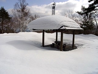 | 鉄塔の立つ広場の奥には山の家が見える | 長者公園の東屋 | 山頂への分岐点 犬の足跡も続く |