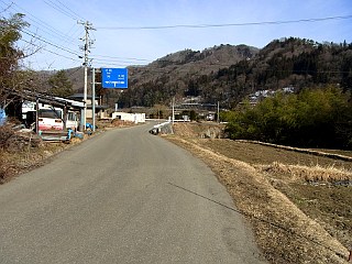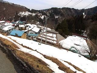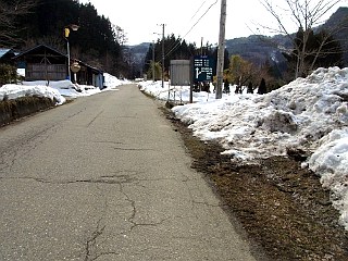 | 集落に着くと道の雪が無くなる | 日向畑というバス停のある県道出合 | 左右方面への近道は通行止め |