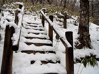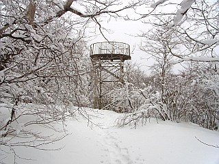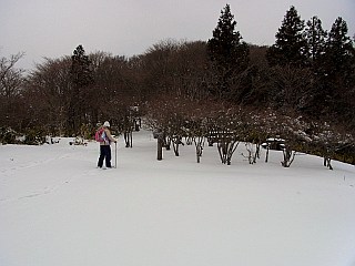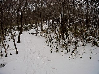 | 山行記 | ●最も近場のスノーシュースポットとして注目していた愛知県最高峰の茶臼山へ行くことにした。道は最も近い国道151号線からの道を選んだが、駐車場まで後一息というところで先行の車が立ち往生しており、こちらも四駆ではなく自信も無いのでその道は断念、国道151号線まで戻って、津具から茶臼山高原道路を通るコースに切り替えた。 ●茶臼山高原道路はよく雪も融けており、大きなアップダウンも無いので難無く茶臼山の第一駐車場に着くことができた。少し遅れをとったと思ったが、第一駐車場はまだ四分の一ぐらいしか埋まっておらず、スキーシーズンも終わり(15日まで営業)を感じさせられた。 ●スキー場の入り口でスノーシューを装着しファミリーゲレンデの右隅を登っていく。すぐに最初から見えていたレストラン「てんくう」の裏に着く、レストランは今シーズンの営業を終えたのか、テラスには1m近い雪が積もったままだ。 ●レストランの向こうが疎らに駐車車両のある第二駐車場で、雪も積もっているのでスノーシューで茶臼山西登山ルート入口まで歩いた。 ●西登山ルート入口から山道が始まる。既に多くの人が歩いているらしく踏み後が多く歩きにくい。その先の一面の雪の中に思い思いに付けられた踏み後はどれが正規のコースかわからないが、スノーシューなら何処を歩いても大丈夫だ。 ●左に車道が見える辺りから傾斜が増してくる。ここも何処を歩いても大丈夫だが、正規に近いコースを取り、回り込むように自由の広場へと登って行く。 ●自由の広場からはスキー場のある萩太郎山の斜面が良く見えるが、天気も下り坂で、霞んでいてその背後に見えるはずの奥三河の山々は見ることができない。 ●自由の広場から先は樹林帯の中の山らしい道が始まる。すぐに展望台が見えるが、そのあたりからスノーシューが苦手とする木の階段が始まる。階段がすっぽりと雪で覆われていればいいが中途半端な雪の状態では歩きにくいので階段の脇を通るなどして登っていく。 ●すぐに山腹のトラバースになるのでしばらくは歩きやすくてほっとするが、森の広場への分岐からまた急な木の階段が始まり、またまた難儀をしながら登って行く。木の階段交じりのジグザグの急登を登り切ると、再び周囲が開けた稜線に出る。稜線からは萩太郎山が見えるが、雪も降り出してさらに霞んで見える。 ●後は、雪を載せた美しい木々の間に付けられた平坦な道を歩けば展望台のある茶臼山の山頂だ。展望は期待できないが、とりあえず雪が沢山積もる展望台に登ってみる。やはり、目と鼻の先の萩太郎山ですら霞む程だった。 ●山頂から平坦な道をさらに進むと長野側の金属製の展望台があるが、これはスノーシューのままでは登り難いし展望も期待すべくも無いので登るのは止め、そこから続く雷岩方面に下ることにした。 ●雪がいっぱいの急な斜面を下ると、ほぼ雪に覆われた雷岩が現れる。ここは東登山口方面との分岐になっているので、西登山口方面へ戻るため、ささやきの小路と言われる道を進む。ここは以前ラッセルで苦労したところだが、今回はスノーシューなので楽勝だ。 ●山腹をトラバースするささやきの小路は、途中で森の広場へ続く道と分岐し間違えやすいが、右のささやきの小路を進むと、やがて先程の西登山口から続く道に合流するので、それを戻ることになる。 |