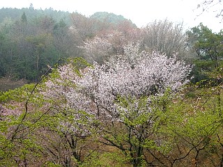 | 見頃を迎えた世界の桜の園とシュンラン咲く県境稜線 | ||