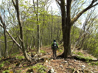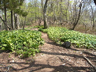 | ヤマタイミンガサとバイケイソウの多い稜線 | 小舟伏山 | 樹間に舟伏山が見える |
