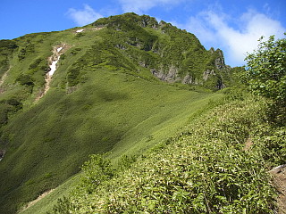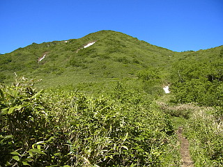 | 半面山山頂から見る雲峰山と芦別岳 | 半面山を振り返る | 行く手に聳える雲峰山 |