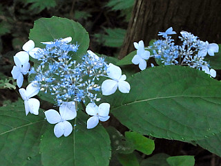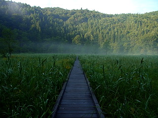 | 山行記 | ●信州百名山の最後の山である東山へ登ろうと、夜中に豊川を出て奥裾花自然園を目指したが、アプローチの道が災害復旧工事のため全面通行止め、奥裾花自然園も休園とのこと。今年の5月の登山記録を見て出かけたのだが、どうやら、ミズバショウの時季が終わるのを待って工事を再開したらしい。 ●とはいっても、せっかく遠路遥々来たのだし、北アルプスの展望も良く、このまま帰るのももったいないので、とりあえず白馬方面へ向かった。とはいっても、ほかの山の資料は一切持っていないし、腰の調子も良くないので、今更ボリュームのある山は登りたくない。それでは、鷹狩山でも登って帰ろうと白馬方面から大町方面へ向かう途中、親海湿原へも寄っていくことにした。 ●いつものように佐野坂スキー場の大きな駐車場に車を停め、早朝で、車の通行の少ない国道を渡って親見湿原へと歩いていく。まずはハナウドが出迎えてくれ、オオウバユリの蕾やヤマキツネノボタンなどが咲いていた。 ●橋を渡り姫川源流への道を分け、最後の民家を過ぎると親見湿原が広がる。親見湿原には少し霧がかかりいい感じだ。まず、目に入ったのはクサレダマだが、そろそろ盛りは過ぎているようだった。そしてドクゼリやコオニユリ、サワギキョウ、コバギボウシなど、こんなに花の多い親海湿原は初めてだ。 ●木道が終わると、湿原の縁に付けられた道を歩く。林内にはエゾアジサイ、オトギリソウ、湿原側にはオタカラコウが咲いていた。湿原入口に戻ると今度は戻る方向に続く姫川源流方面へ進む。林内の道は、一度折り返してさらに続く。途中、ドウカク山山頂まで560mという案内に従ってドウカク山方面へ行ってみることにした。 ●これまでと同じく緩やかな斜面が続くが、あまり歩かれていないのか、倒木や草木の張り出しが多く、少々ヤブっぽい。それよりも、およそ山へ登るというイメージとは程遠い緩やかな斜面が続き、最後もジグザグしながら緩やかに登ってドウカク山の山頂に着く。樹林に囲まれ展望のない山頂には、野鳥の紹介とドウカクの山名の由来を記した看板が設置されていた。 ●山頂手前には急な下り道が姫川源流へと続いているので、それを下ってみることにした。注意書き通りの急な下りは階段が付けられており、姫川源流へ続く林道と合流する。合流点付近にはオカトラノオとドクダミが群生していた。少しその林道を歩くと、親海湿原へ行く道と姫川源流へ行く道とに分かれるので姫川源流方面へ進む。 ●姫川源流には東屋と姫川源流で観察できる草花を紹介する看板が立っている。この時期、姫川源流は花盛りの親海湿原とは打って変わって花が少ない。かろうじて、霧が漂う清流の水面の上に顔を出すバイカモが見られるぐらいだった。それでも、姫川源流を一周して駐車場に戻り、車で次の鷹狩山を目指した。 |