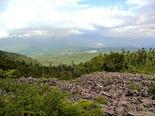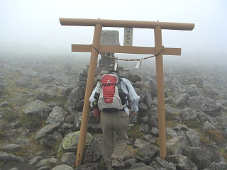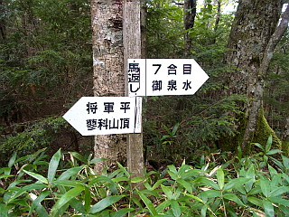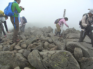 | 山行記 | ●職場のクラブで久しぶりに蓼科山に登ることになった。朝5時に豊川を出発し、9時前に七合目登山口に着いたが、登山口の駐車場は既に満車、仕方がないので、少し手前の駐車場に車を停めた。しかし、この駐車場もほぼ満杯状態だった。 ●支度をして登山口の鳥居を潜って登山道に入る。北八ヶ岳らしい樹林帯の中、緩やかな道を進むと「馬返し」という看板が現れる。その後もしばらく緩やかな道が続くので、そこで馬を返してしまうのかと疑問も感じる。 ●緩やかな道は、突然ジグザグの坂道を登るようになり、やがて「天狗の露地」への分岐に到着する。登山道から外れてその天狗の露地を見ていくことにする。天狗の露地は、岩石を敷き詰めたような裸地で、雲が多く遠くは見えないが、女神湖などを見ることができた。 ●天狗の露地を過ぎる辺りから、登山道は徐々に急になり、ザンゲ坂と呼ばれる木々が散乱する岩石の多い道をジグザグに登る。行く手が明るくなってくると、蓼科山荘の建つ将軍平と呼ばれる広場に出る。蓼科山荘前のテントではバッジやバンダナなどのオリジナルグッズが売られていた。 ●将軍平で少し休憩した後山頂を目指す。最初は緩やかな道もすぐに急坂になり、濡れて滑りやすくなった大きな岩をよじ登るように登る。この日は登山者が多く、すれ違いも大変で、山頂直下では登る登山者が渋滞するといった状況だった。 ●道が左に巻くようになると、やがて蓼科山頂ヒュッテに到着する。とにかく登山者が多く、特にこの辺りは登山者の行き来が激しく、まるで繁忙期の観光地のようだ。 ●蓼科山頂は広いが、登山者でごった返している。自慢の展望はというと、ガスがかかりなにも見ることができない。どうやら日本に接近しつつある台風の影響だということで、独立峰の蓼科山の山頂部には既にその影響が出ているとのことだった。 ●とりあえず一等三角点のある山頂を探す。石に着けられた黄色のペンキを辿って山頂に着くが、やはり多くの登山者が記念撮影をしているので、順番を待ってこちらも記念撮影をした。 ●せっかくなので蓼科神社奥宮でお参りをし、近くで休憩をとった。ガスは時折薄くなるが、晴れることはなさそうで、晴れたにしても遠くの山も雲をかぶり、見ることができそうではないので、来た道を戻ることにした。 |